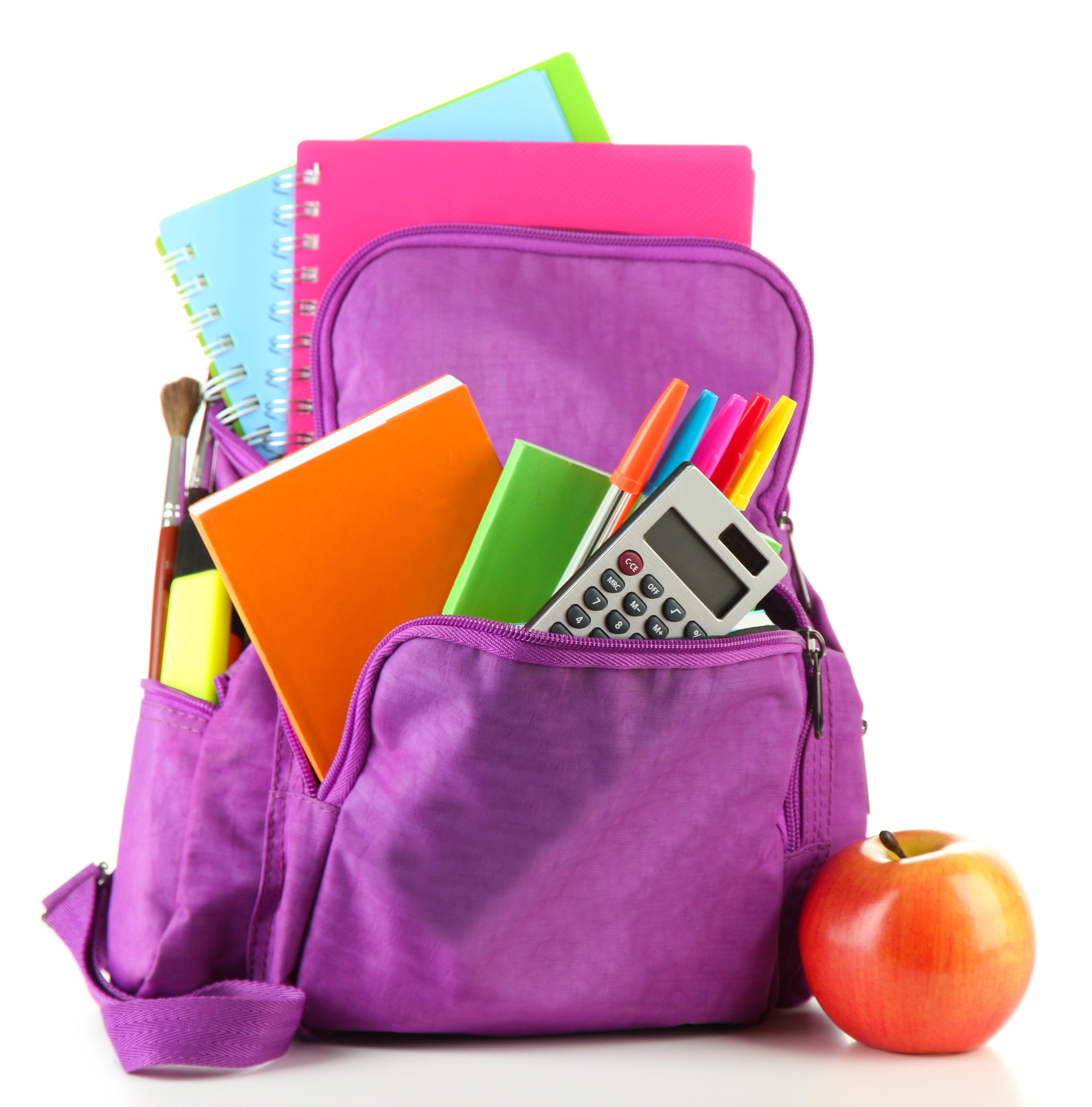 Purple backpack with school supplies isolated on white