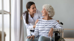Caregiver supporting smiling disabled older woman sitting in whe